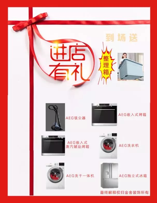 超多禮品當(dāng)場(chǎng)放送,德國(guó)AEG的電器,整理箱,還有各種代金券,只要你選擇金舍就會(huì)讓你車(chē)的后備箱完全填滿(mǎn),不會(huì)留下一個(gè)空白。凡活動(dòng)期間(9月28日—9月30日)有裝修需求的客戶(hù)可進(jìn)店詳詢(xún),均會(huì)獲得巨大家居整理箱。