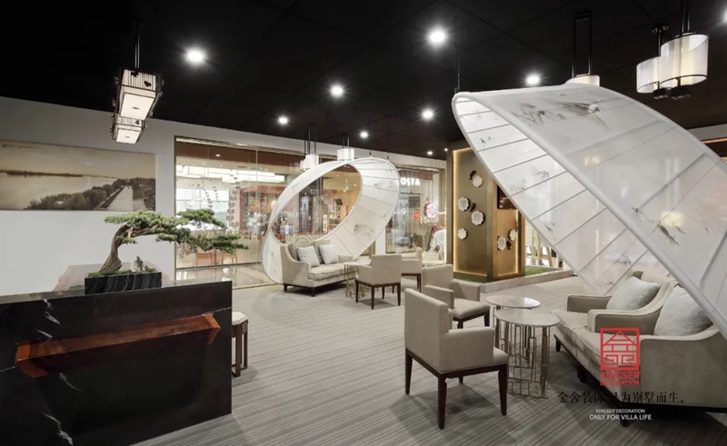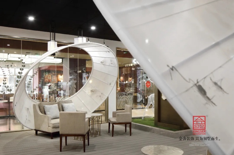 -御河上院在商場的樓盤展示區(qū)裝修實景,在設(shè)計中將自然與人文的意象融入室內(nèi)設(shè)計,綠意盎然的自然景象以其深厚的文化底蘊滋潤著人們的心靈,對自然的認識和感悟,讓人豁然開朗,心曠神怡,也就成為中國傳統(tǒng)文化資產(chǎn)的傳承、轉(zhuǎn)譯與新生 。