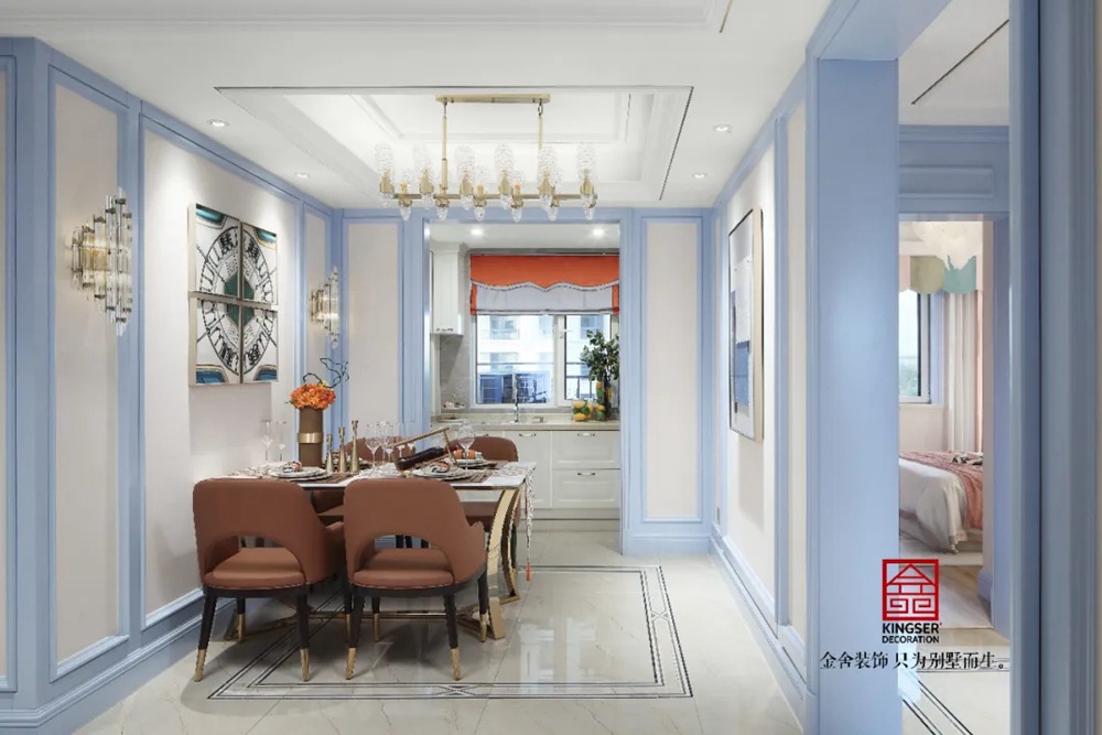 餐廳給人一種輕松優(yōu)雅的感覺,也極大的豐富了雅致的含義,從造型獨特精致的吊燈,到清新自然的家居配色,以及簡單的家居搭配,都極好的將美式家裝強大的包容力展現(xiàn)出來,并優(yōu)雅的組合在一起。