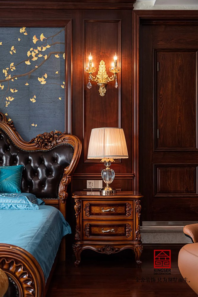 質(zhì)感極佳的壁紙設(shè)計和富有層次的布局設(shè)計,凸顯出整體空間的美觀和優(yōu)雅。銅制的金色水晶吊燈,不但增添了空間的雅致感,更是瞬間豐盈了整體的視覺效果。