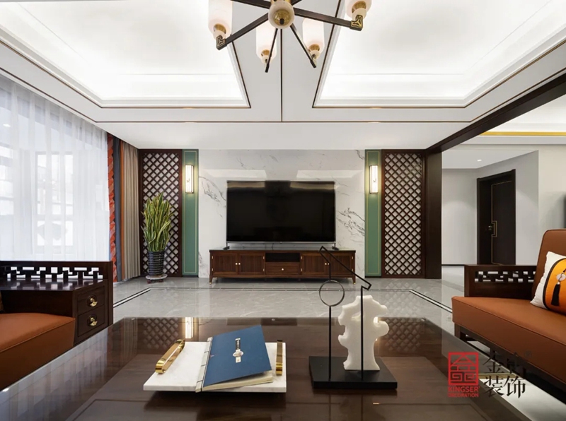 詩如明月,飛波揚彩;明月如詩,玉潤冰清??蛷d沙發(fā)背景墻的圓形裝飾就如同一輪皎皎于天際的明月,暈染了整個空間,唯美之感頓生。電視墻對稱的花格設計突出了傳統(tǒng)中式的風范,古典精致的空間不失通透靈動的氣質,山水感十足大理石與造型古樸的壁燈結合,穩(wěn)重大氣。色彩濃厚的軟裝配飾在這魅力的客廳里,隨性地揮灑出沉穩(wěn)的古樸之美。