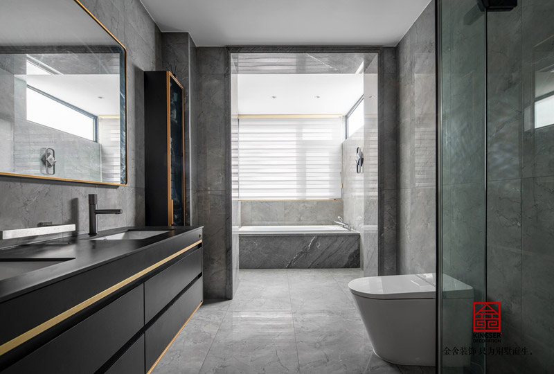 衛(wèi)浴間在設(shè)計(jì)上以瓷磚為主?;疑罄硎y理,在花紋、款式上達(dá)到了統(tǒng)一,再次印證了——顏色搭配也是需要精心設(shè)計(jì)的。金屬線條的浴室柜,將整體的顏色一下子烘托了出來。