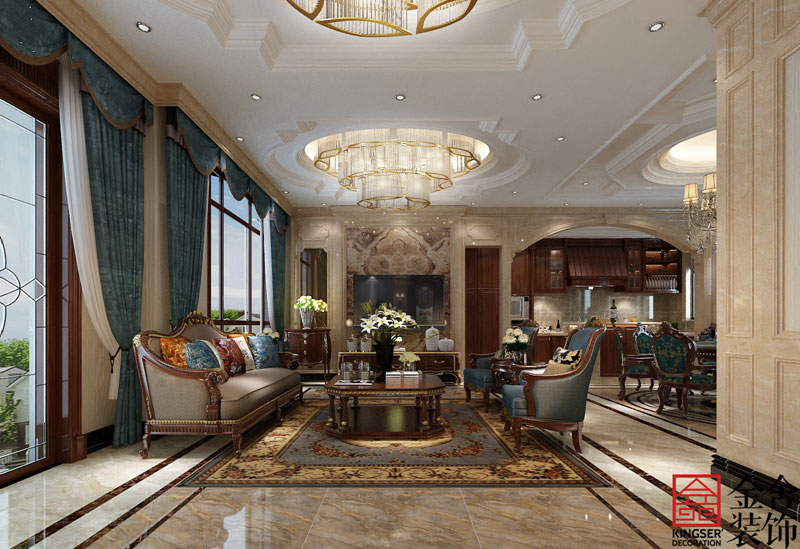 客廳:美式客廳風(fēng)格較多采用嵌入式石膏吊頂,搭配精致的水晶吊頂,營(yíng)造出一種懷舊、浪漫的感覺。以大理石作為地面裝飾材料,石材作為墻面裝飾材料,光澤感極佳,在沙發(fā)區(qū)域鋪上大幅花紋地毯,使空間區(qū)域劃分更加清晰。復(fù)古造型的組合沙發(fā),以及茶幾都具有上乘的質(zhì)感,讓美式古典風(fēng)格更加的彰顯。