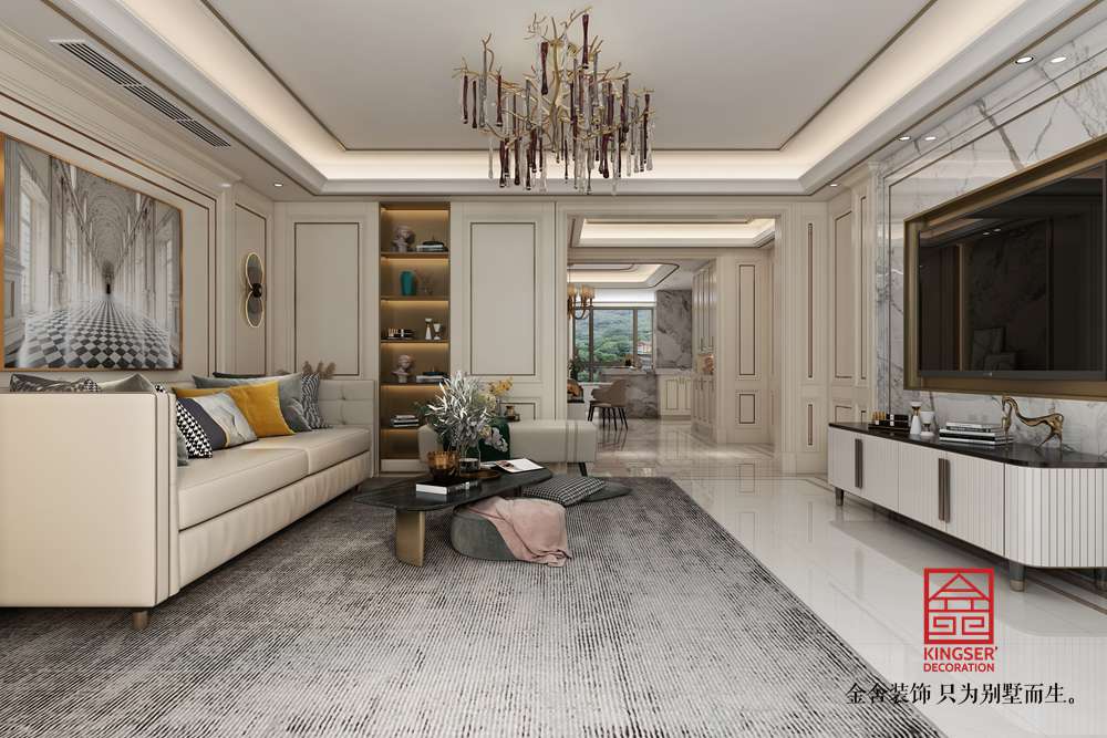 設(shè)計(jì)說明:此案例為石家莊金舍裝飾-榮盛華府205平米美式風(fēng)格裝修效果圖。美式風(fēng)格的客廳面積很大,看上去就很氣派,加上非常有質(zhì)感的家具,盡顯奢華意境,美式風(fēng)格的裝修很注重各種線條的裝飾,吊頂和墻面上都有美觀的線條,水晶吊燈更是增加了整個(gè)客廳的亮度,同時(shí)也提升了檔次,墻面上的掛畫非常有藝術(shù)氣息,體現(xiàn)了主人的文化底蘊(yùn),在這樣的客廳里家人一起休閑娛樂或是招待客人都是非常好的。