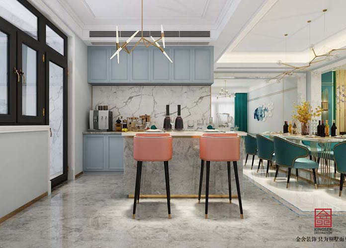 設計說明:此案例為石家莊金舍裝飾-林蔭大院260平米輕奢風格裝修效果圖。設計之美不應全倚仗修飾,而應該醉在靈魂。金屬的高貴冷感,更易與小物件和小細節(jié)催生出默契,精致的輕奢氣質點睛而出。