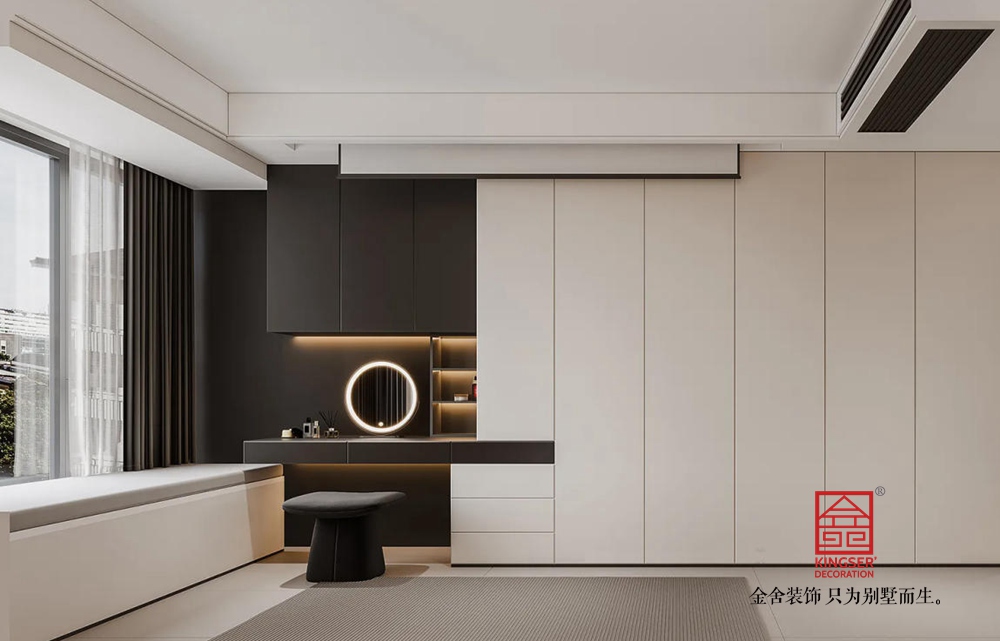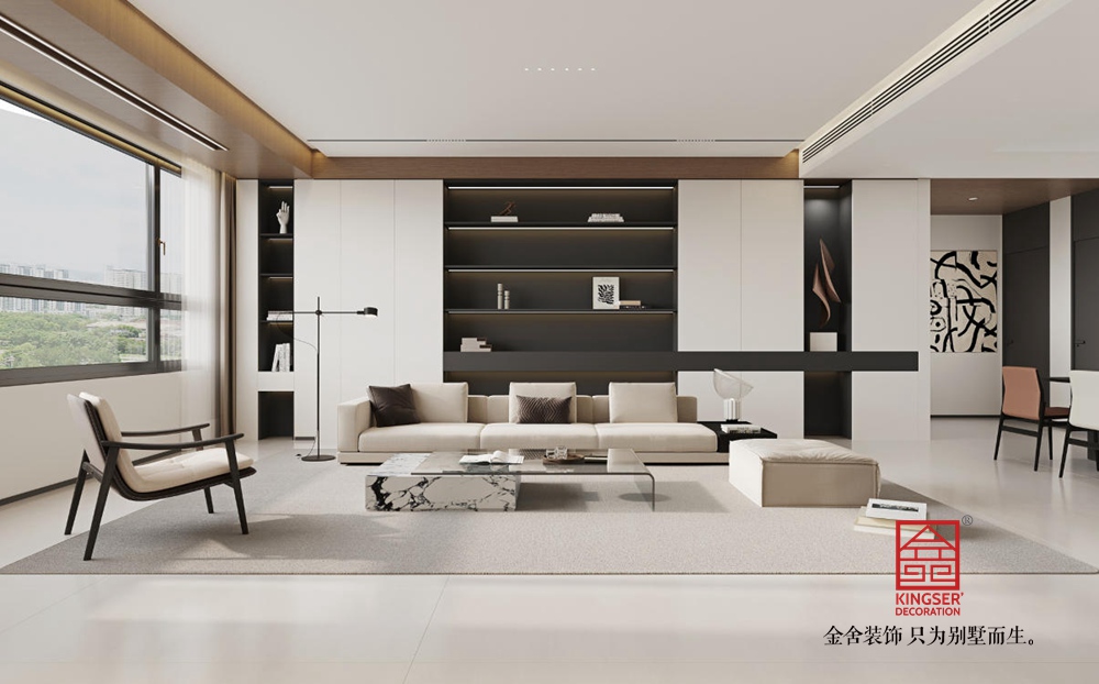 空間布局上,采用開放式設計,讓客廳與周邊區(qū)域自然銜接,增強了空間的通透感與互動性。大面積的落地窗是設計亮點,引入充足自然光線,同時將城市景觀納入室內,使空間與外界環(huán)境有機融合。