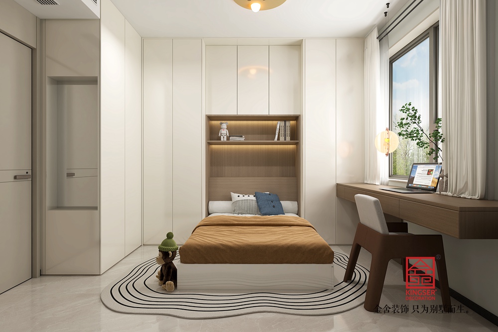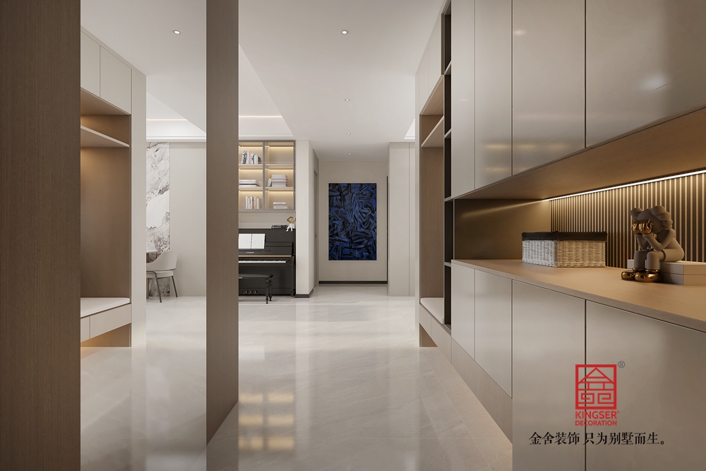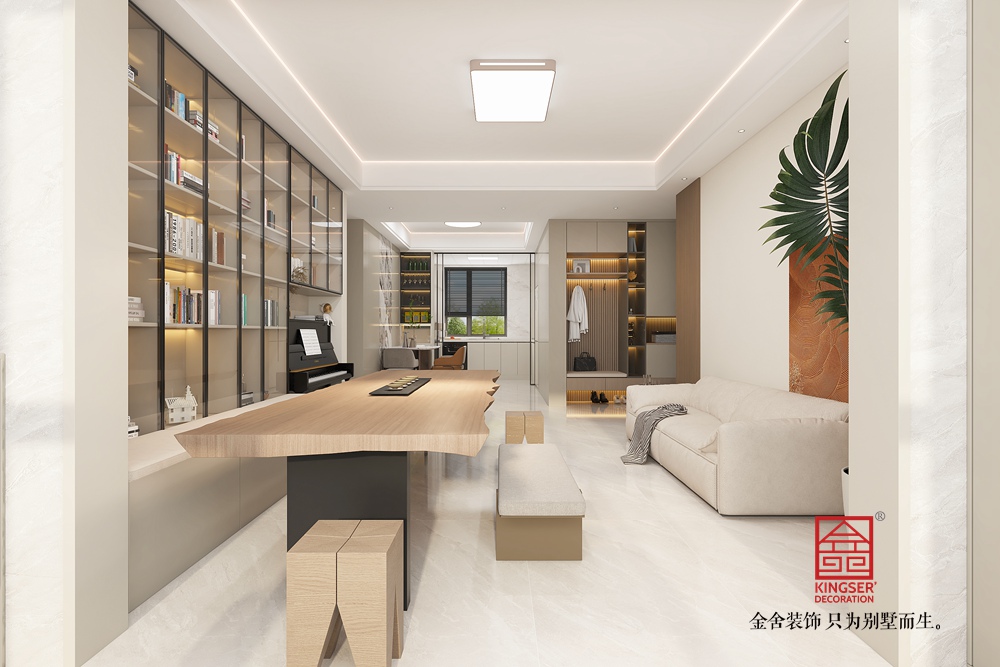 此空間采用去客廳化設(shè)計(jì),打破傳統(tǒng)客廳單一社交功能的局限,打造出集閱讀、藝術(shù)、休閑等多元體驗(yàn)于一體的復(fù)合區(qū)域。 整面玻璃書柜兼具收納與展示功能,暖光加持下,書籍仿若藝術(shù)品,營(yíng)造出靜謐的閱讀氛圍。原木長(zhǎng)桌造型獨(dú)特,成為空間核心,可滿足閱讀、手工等多樣需求,搭配簡(jiǎn)約座椅與長(zhǎng)凳,為互動(dòng)交流提供靈活場(chǎng)景。鋼琴的融入,為空間注入藝術(shù)氣息,讓居者能隨時(shí)沉浸于音樂(lè)世界。