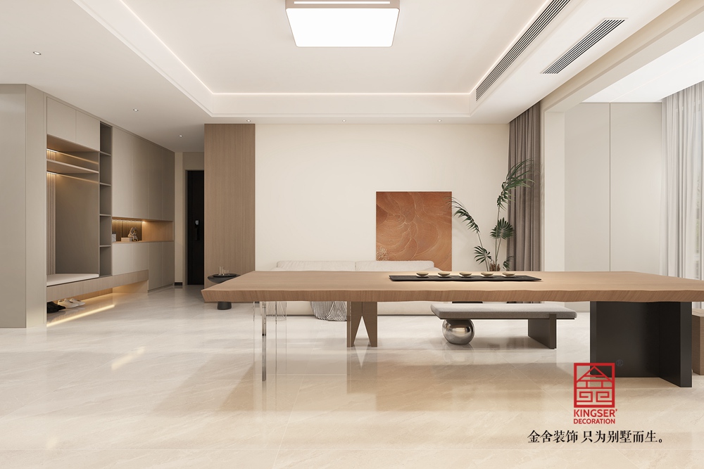 材質(zhì)上,原木的自然質(zhì)感、大理石的光潔以及金屬的精致相互融合,層次豐富。燈光設(shè)計(jì)巧妙,嵌入式燈帶與頂燈營(yíng)造出柔和均勻的光照,凸顯空間通透感。整體設(shè)計(jì)摒棄傳統(tǒng)客廳的刻板,以實(shí)用與美學(xué)兼具的布局,為居者帶來(lái)更具個(gè)性與深度的生活體驗(yàn),詮釋了去客廳化設(shè)計(jì)對(duì)生活方式的創(chuàng)新與升級(jí)。