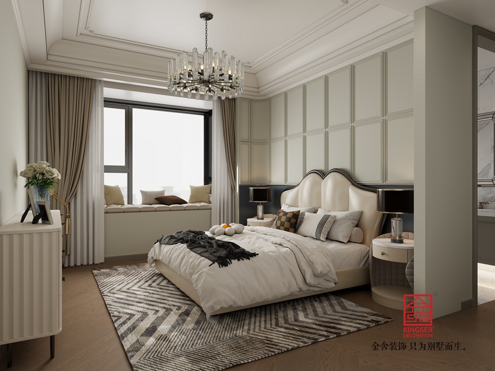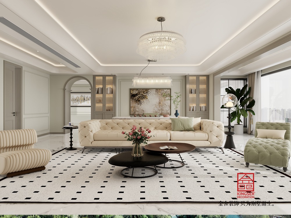 地面黑白幾何圖案地毯,為空間增添時(shí)尚與秩序感,成為視覺(jué)亮點(diǎn)。整體布局合理,各區(qū)域過(guò)渡自然,在滿足功能需求的同時(shí),盡顯高雅輕奢的設(shè)計(jì)美學(xué)。