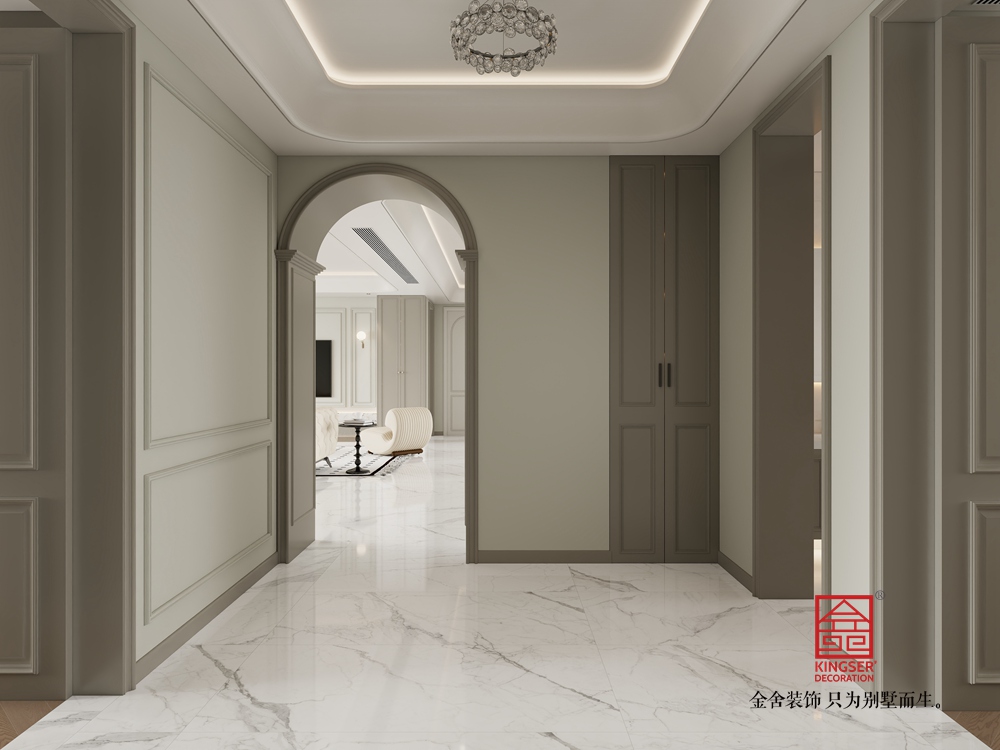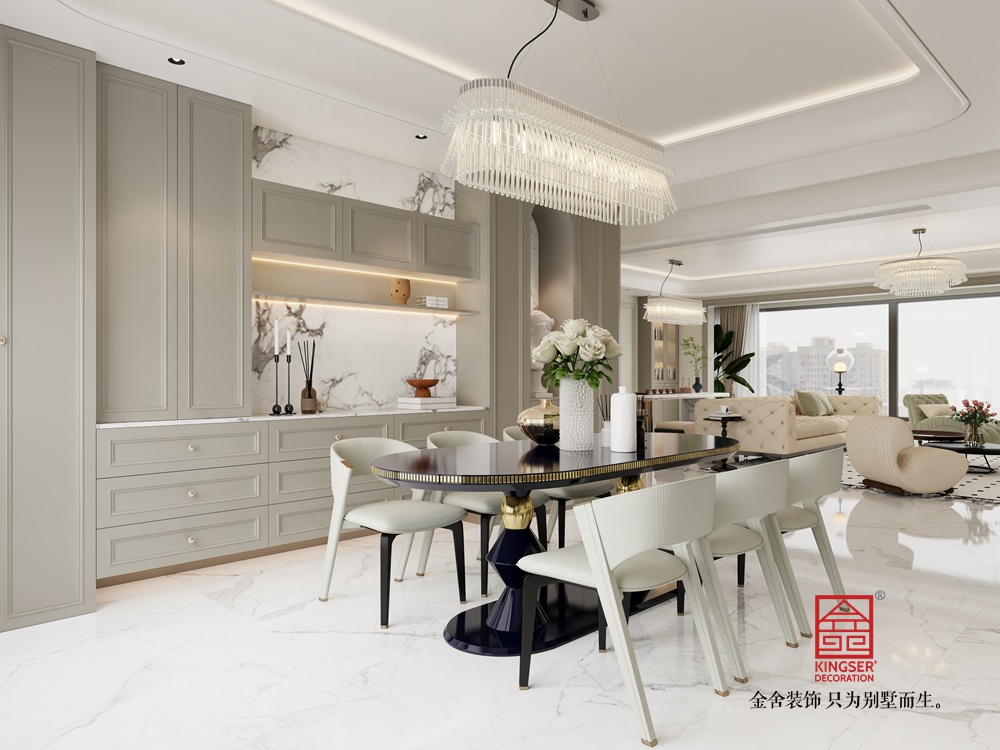 水晶吊燈與長(zhǎng)條吊燈交相輝映,散發(fā)著精致光澤,提升空間格調(diào)。家具選擇上,米色皮質(zhì)沙發(fā)質(zhì)感上乘,搭配造型簡(jiǎn)約的茶幾,營(yíng)造出舒適且具品味的休憩區(qū)域。