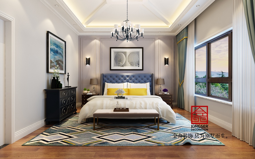 主臥在放高足夠的情況下采用了“回”字形吊頂,第二階的“口”字形造型把整個空間向上拉伸,顯得空間更加寬敞、高大??紤]到臥室的休息性,在色調(diào)上采用了淺灰色作為背景墻的主色調(diào),即溫和又不會顯得沉悶,有助于提高業(yè)主的睡眠質(zhì)量。經(jīng)典的美式“三段式”’造型,沒有過多復(fù)雜邊線,簡潔干練,搭配頗有現(xiàn)代感的金屬燈飾及飾品,使整個空間簡而不失潔時尚。整體的方案圍繞清新的美式風(fēng)格的簡單舒適,質(zhì)樸典雅來設(shè)計,